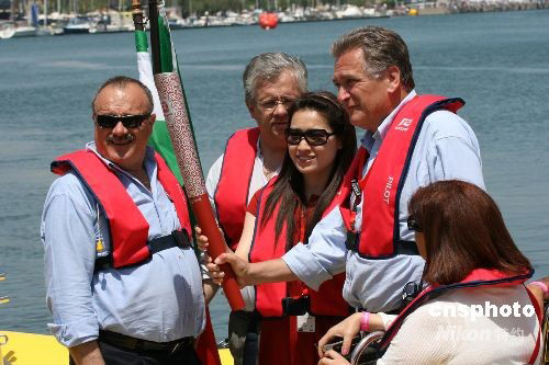 葡萄牙當(dāng)?shù)貢r(shí)間5月4日下午,F(xiàn)1摩托艇世錦賽葡萄牙站比賽在葡萄牙波爾蒂芒舉行,北京2008奧運(yùn)火炬手羅雪娟帶著她收藏的“祥云”奧運(yùn)火炬來到F1賽場(chǎng),在賽場(chǎng)會(huì)議上羅雪娟和國(guó)際摩聯(lián)F1委員會(huì)主席尼克魯共同呼吁:“崇尚體育精神、支持北京奧運(yùn)”。在本次2008F1摩托艇世錦賽決賽前,羅雪娟和她收藏的“祥云”火炬被國(guó)際摩聯(lián)邀請(qǐng)到巡游艇上,進(jìn)行賽前繞場(chǎng)一周巡游。這是奧運(yùn)火炬首次出現(xiàn)在F1賽場(chǎng)。中新社發(fā) 北京泓鼎 攝