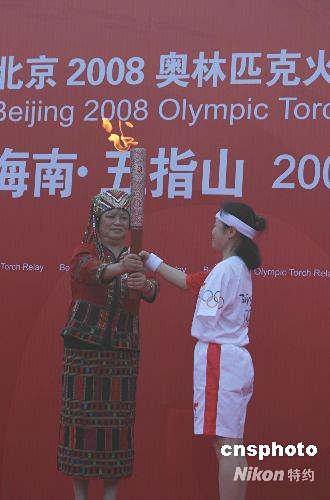 5月5日早上7時(shí)5分,北京奧運(yùn)圣火在海南省腹地五指山市傳遞,五指山市是海南省黎、苗族聚居區(qū)域。圖為第一棒火炬手第十二屆殘奧會(huì)冠軍黎玉強(qiáng)(右)從海南省人大常委會(huì)副主任符桂花手中接過(guò)奧運(yùn)火炬。中新社發(fā) 尹海明 攝