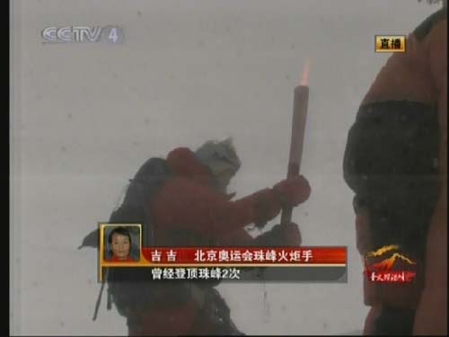 火炬手吉吉成為登頂珠峰第一棒。圖為電視截圖。