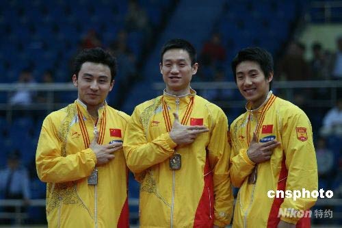5月9日,2008年全國體操錦標(biāo)賽暨奧運選拔賽男子全能決賽頒獎儀式在天津體育中心舉行。楊威(中)以96.900分奪得男子全能金牌,馮喆、滕海濱分獲第二、第三名。中新社發(fā) 田齊 攝