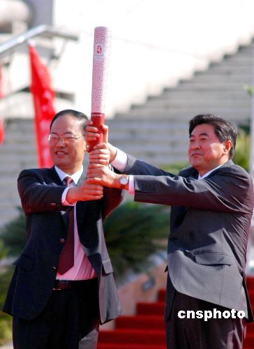 五月十二日上午,北京奧運(yùn)會(huì)火炬在福建省泉州市閩臺(tái)緣博物館廣場(chǎng)開(kāi)始傳遞。圖為新上任的泉州市委書(shū)記徐鋼(左)從北京奧組委火炬接力中心副主任劉寶杰手中接過(guò)“祥云”。中新社發(fā) 傅丹丹 攝