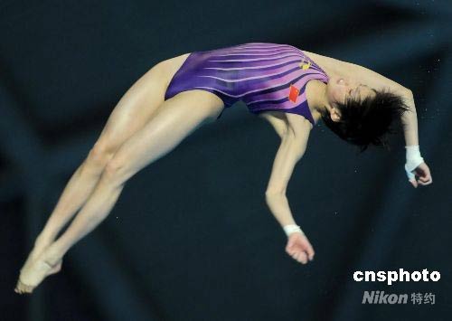 5月30日,2008年國際泳聯(lián)美的世界跳水系列賽女子十米臺決賽在南京奧體中心游泳館進行,中國選手陳若琳獲得冠軍。世錦賽冠軍王鑫由于在第一跳出現(xiàn)重大失誤得到零分,最終與獎牌無緣。中新社發(fā) 劉建民 攝
