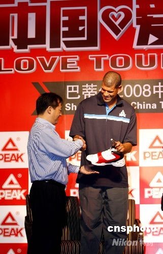 八月二十八日,美國NBA火箭隊球星肖恩.巴蒂爾出席第三代戰(zhàn)靴新聞發(fā)布會。巴蒂爾向中國籃球博物館負責人(左)贈送展品。中新社發(fā) 王麗南 攝