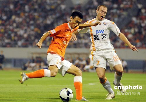 2008年9月7日,中國足球超級聯(lián)賽第9輪在山東濟南的一場比賽,主場作戰(zhàn)的山東魯能泰山隊以2比1戰(zhàn)勝青島盛文中能隊。中新社發(fā) 張侃 攝