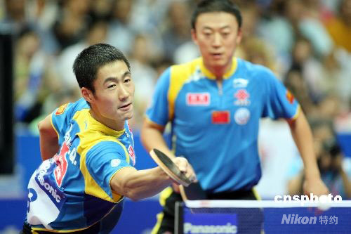 9月14日,2008年國(guó)際乒聯(lián)職業(yè)巡回賽中國(guó)乒乓球公開賽在上海舉行,中國(guó)選手王勵(lì)勤(左)與馬琳在男子雙打決賽中,以4:3戰(zhàn)勝隊(duì)友王皓與陳玘獲得冠軍。中新社發(fā) 湯彥俊 攝