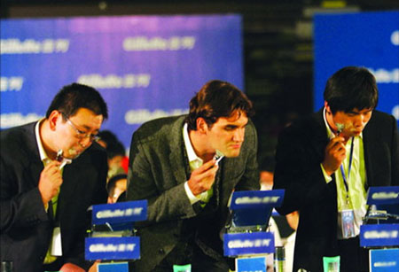 一通大山侃完,費德勒開始跟大學(xué)生代表近距離互動,這次他送出的禮物是自己當(dāng)場簽名的《費德勒自傳》。最后的剃須環(huán)節(jié)則與去年完全一致,費德勒一手拿著麥克風(fēng)一手拿著剃須刀“言傳身教”,告訴學(xué)生們哪些是正確的剃須方式,哪些是不該養(yǎng)成的壞習(xí)慣。臺下千余人集體效而法之,人人下巴上沾滿白色潔面膏的場面猛一看去,倒也蔚為壯觀。特派記者 劉皓