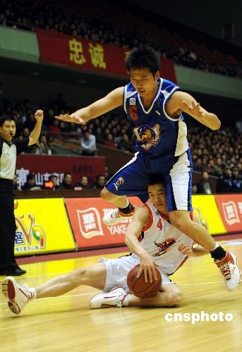 2008年11月16日,2008-2009CBA聯(lián)賽常規(guī)賽首輪在山東濟南的比賽中,主場作戰(zhàn)的山東黃金男籃以94-74戰(zhàn)勝天津榮鋼男籃,取得開門紅。中新社發(fā) 張侃 攝