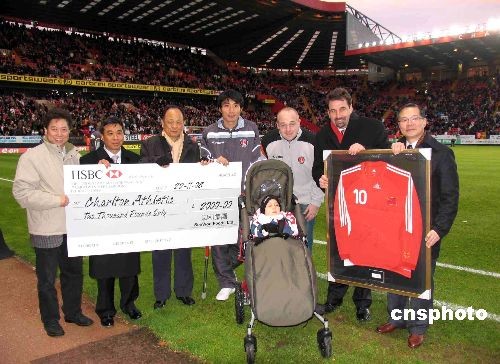 當(dāng)?shù)貢r(shí)間11月22日下午,倫敦,英冠聯(lián)賽第18輪,查爾頓主場迎戰(zhàn)謝菲爾德聯(lián)隊(duì)。中場休息之際,查爾頓隊(duì)中國球員鄭智(左四)現(xiàn)場貢獻(xiàn)出一件親筆簽名的在中國國家隊(duì)所披10號戰(zhàn)袍,拍賣所得款項(xiàng)為一位殘疾小球迷購買高級輪椅。英國泗和行集團(tuán)老板謝貴全(左三)當(dāng)場慷慨解囊兩千英鎊,拍得該件球衣。中新社發(fā) 楊冉 攝