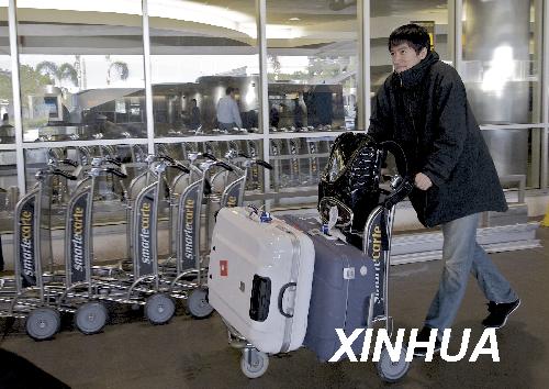 劉翔(右)與母親吉粉花(左)、中國(guó)田徑隊(duì)總教練馮樹(shù)勇抵達(dá)美國(guó)洛杉磯國(guó)際機(jī)場(chǎng)