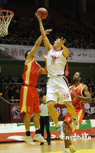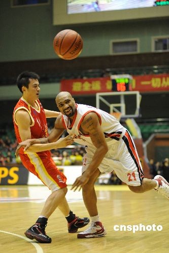 12月5日,2008—2009賽季CBA聯(lián)賽第九輪在山東濟(jì)南的一場比賽中,主場作戰(zhàn)的山東黃金隊(duì)以108比78戰(zhàn)勝青島雙星隊(duì)。中新社發(fā) 張侃 攝