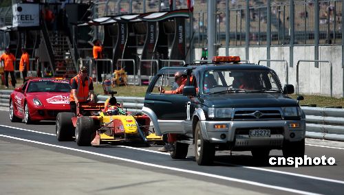 1月25日,在新西蘭陶波,A1世界杯汽車大獎(jiǎng)賽2008/09賽季第四站第二日比賽舉行。中國隊(duì)車手程叢夫參賽,在比賽接近尾聲時(shí),中國隊(duì)賽車發(fā)生意外,被拖車拖回維修站,所幸選手沒有受傷。中新社發(fā) 李凌昊 攝
