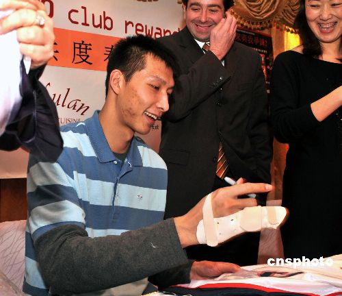 圖為右手手指受傷的易建聯(lián)為球迷簽名。