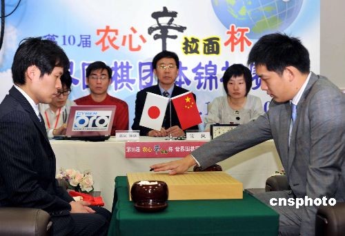 二月十七日,第十屆“農(nóng)心杯”世界圍棋團(tuán)體錦標(biāo)賽第三階段比賽在上海舉行,首戰(zhàn)由中國棋手常昊九段(右)挑戰(zhàn)日本擂主高尾紳路九段(左),本階段比賽將決出最后冠軍和2億韓元冠軍獎金的歸屬。中新社發(fā) 湯彥俊 攝