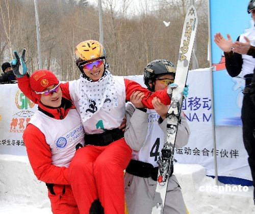 2月24日,第24屆世界大學(xué)生冬季運(yùn)動(dòng)會(huì)在哈爾濱亞布力滑雪場(chǎng)進(jìn)行自由式滑雪空中技巧混合團(tuán)體賽。中國隊(duì)派出男女個(gè)人賽的冠軍賈宗洋和李妮娜以及男隊(duì)的劉忠慶三人出戰(zhàn),三人均完美地完成動(dòng)作,最終以總分335.24獲得冠軍。 中新社發(fā) 鄭宇鈞 攝