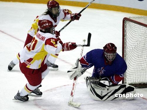 2月24日,第二十四屆世界大學(xué)生冬季運(yùn)動(dòng)會女子冰球小組賽最后一輪的比賽在哈爾濱冰球館結(jié)束,在晚間結(jié)束的比賽中,中國隊(duì)以8比0大勝英國。這樣中國女冰就以小組第二的身份晉級半決賽,在半決賽中她們將面對小組第三的芬蘭。圖為中國隊(duì)(白)破門得分。中新社發(fā) 富田 攝