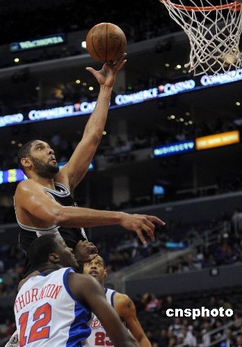 NBA勁旅圣安東尼奧馬刺隊(duì)三月二日晚在客場(chǎng)迎戰(zhàn)洛杉磯快船隊(duì),結(jié)果以106比78大勝主隊(duì),馬刺隊(duì)大前鋒鄧肯全場(chǎng)獨(dú)得16分。中新社發(fā) 張煒 攝