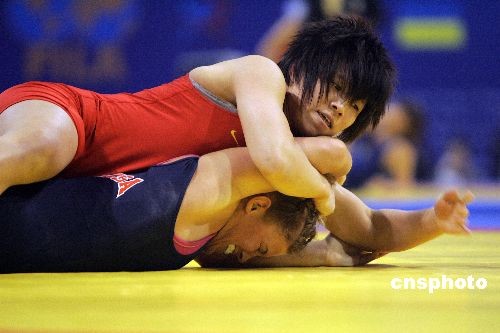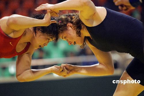 3月21日上午,由國(guó)際摔跤聯(lián)合會(huì)主辦,中國(guó)摔跤協(xié)會(huì)、太原市政府、山西省體育局承辦的“2009年女子摔跤世界杯比賽”將于今日在太原拉開(kāi)戰(zhàn)幕。在進(jìn)行的小組賽第一輪中,奧運(yùn)冠軍王嬌領(lǐng)銜的中國(guó)隊(duì)以總比分5:2戰(zhàn)勝日本隊(duì),贏得開(kāi)門紅。中新社發(fā) 張?jiān)?攝