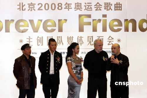 十一月二十九日晚,北京奧運會歌曲《Forever Friends》音樂電視拍攝順利收工。該歌曲由意大利作曲家喬吉奧.莫洛德爾領銜作曲,德國詞作家邁克爾.昆茨作詞,中國音樂家孔祥東擔綱制作,李汶、孫楠演唱。中新社發(fā) 任海霞 攝