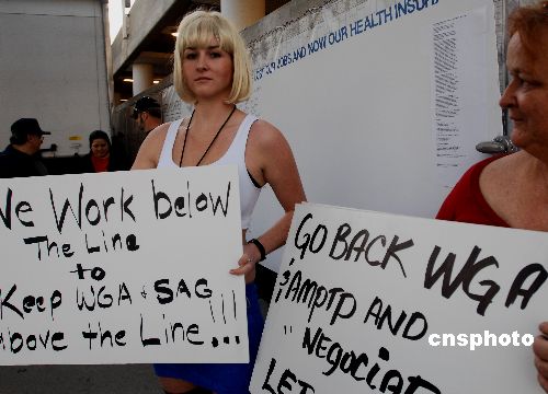 第65屆金球獎頒獎典禮當地時間一月十三日被迫在美國洛杉磯比佛利山希爾頓酒店改為記者出席的新聞發(fā)布會,創(chuàng)歷史的沒有紅地毯,毫無好萊塢星光,卻有罷工的美國編劇協會在現場抗議示威。
