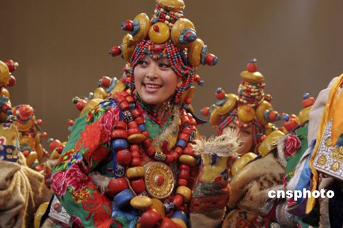 2008年1月21日,著名舞蹈家楊麗萍攜《藏謎》在海口人民大會(huì)堂上演!恫刂i》以藏族老阿媽虔誠(chéng)的朝拜路途中所見為主線,表現(xiàn)了藏區(qū)牧民生活、民間習(xí)俗、宗教儀式場(chǎng)景。主創(chuàng)人員用了1年多的時(shí)間,行走在藏、青、川、云等各省區(qū)的20多個(gè)藏區(qū),大量收集了音樂(lè)、舞蹈、器樂(lè)、服裝等作為原始創(chuàng)作素材。劇中8成以上的演員都是藏區(qū)的牧民,完全是原生態(tài)的演出。中新社發(fā) 尹恩彪 攝