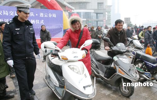 1月28日,連云港市公安局交巡警支隊(duì)和連云公安分局集中返還176輛被盜搶機(jī)動(dòng)車(chē)。去年以來(lái),連云港警方嚴(yán)厲查處各類機(jī)動(dòng)車(chē)違法行為,加大盜搶車(chē)輛的犯罪行為的打擊力度。眾多失主在這批案值約100萬(wàn)元的被盜搶車(chē)輛中,現(xiàn)場(chǎng)將自己被盜搶車(chē)輛領(lǐng)到了手中。中新社發(fā) 王健民 攝