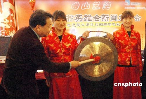 2008年3月20日,著名相聲表演藝術家、中國曲藝家協會黨組書記姜昆來到山東濟南,為《曲山藝海之山東快書英雄會》鳴鑼開賽。中新社發(fā) 張侃 攝