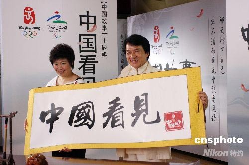 2008年7月8日,北京,2008奧林匹克公園中心區(qū)文化展示活動(dòng)“中國故事”的主題歌《中國看見》正式發(fā)布。此歌由國際巨星成龍與著名歌唱家譚晶攜手演唱。成龍和于丹共同書寫了“中國故事”主題歌《中國看見》的卷軸。中新社發(fā) 博芽影像 攝