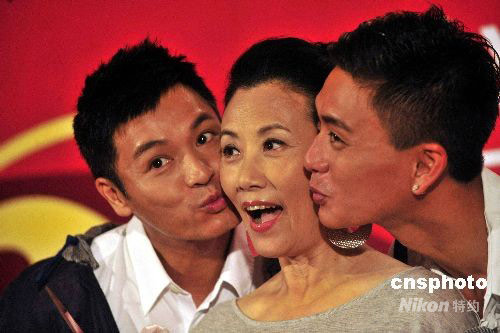 九月二日,香港藝人汪明荃出席記者會(huì)時(shí),受到郭晉安(左)及黃宗澤的親面,祝賀她六十一歲生日快樂(lè)。中新社發(fā) 譚達(dá)明 攝