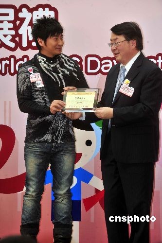 十二月一日是世界艾滋病日,著名歌星孫耀威(左)在香港“2008年世界艾滋病日”活動開展禮上,受到衛(wèi)生署署長林秉恩的致謝。中新社發(fā) 譚達明 攝