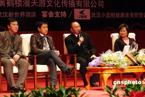 1月9日晚,吳宇森攜《赤壁(下)》三位演員佟大為、宋佳、張山亮相武漢市武昌洪山禮堂出席《赤壁(下)》武漢首映式。中新社發(fā) 李溪 攝