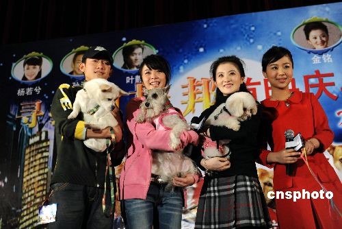二月四日,影視藝人張一山、楊若兮、金銘、楊紫,分別攜帶雪拉瑞、比熊等名犬亮相《尋找狗托邦》首映式。當(dāng)日,電影《尋找狗托邦》在北京上映。該片講述一群浪跡天涯的小狗為救其中一只受傷狗,經(jīng)歷千難萬險(xiǎn)帶它去“狗托邦”治病的故事。中新社發(fā) 廖攀 攝