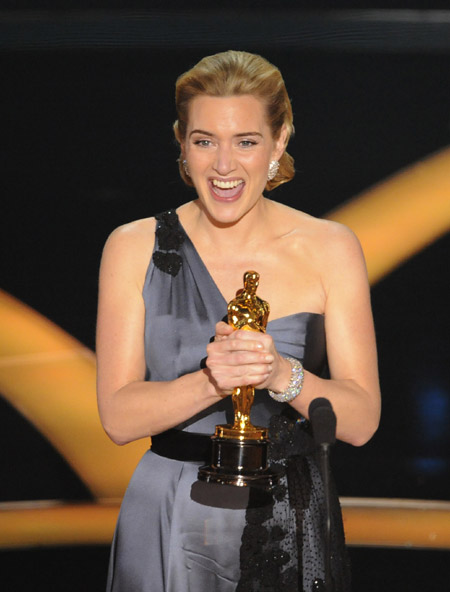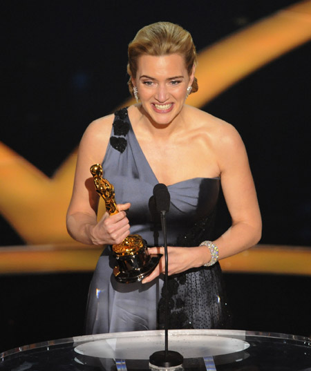中新網(wǎng)2月23日電 美西時間2月22日下午17:00(北京時間2月23日上午9:00),第81屆奧斯卡金像獎頒獎典禮在洛杉磯柯達(dá)劇院舉行,當(dāng)年在《泰坦尼克號》中飾演“露絲”一角而紅遍全球的女星凱特·溫斯萊特,今日第六次沖擊奧斯卡終于得償所愿。她憑借在《朗讀者》中的精湛演技而獲得第81屆奧斯卡最佳女主角,這位女星上臺領(lǐng)獎激動萬分,她說在八歲的時候曾經(jīng)想象這一時刻,當(dāng)時的獎杯只是一個香檳杯子!拔乙兄x我的家人,所有人。我不能忘記你們。我很幸福,擁有一個愛我的丈夫和漂亮的孩子!