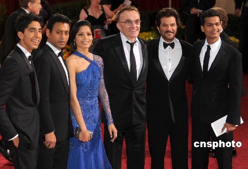 第八十一屆奧斯卡電影金像獎頒獎典禮二月二十二日晚在好萊塢柯達劇場舉行。印度“平民”演員出演的《貧民富翁》如愿以償地榮獲年度最佳影片大獎,成為當晚最大贏家。圖為該片主要演員走過紅地毯。中新社發(fā) 張煒 攝