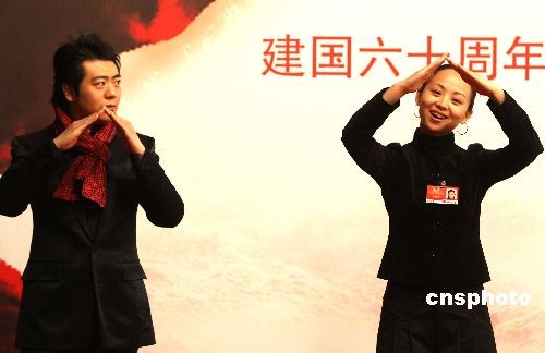 3月8日,建國60周年獻(xiàn)禮歌曲《國家》在北京舉行MV開機(jī)儀式,鋼琴演奏家郎朗、《千手觀音》表演者邰麗華出席儀式。圖為邰麗華(右)用手語演繹歌詞,并現(xiàn)場(chǎng)教授郎朗。中新社發(fā) 張宇 攝