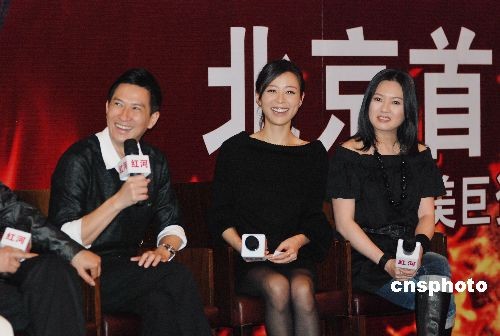 4月7日,情感大片《紅河》在北京舉行首映式,導(dǎo)演章家瑞,演員張靜初、張家輝、李麗珍、李修賢等轉(zhuǎn)戰(zhàn)北京,在電影中雙雙飾演越南按摩女的張靜初和李麗珍還現(xiàn)場(chǎng)pk起越南話來,可謂旗鼓相當(dāng)。而張家輝面對(duì)電影中激情戲被刪減的提問,一句“很遺憾我這么大的犧牲都被剪掉”引得大家大笑不止。中新社發(fā) 李學(xué)仕 攝