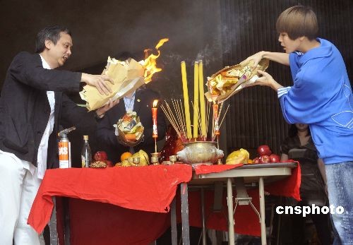 四月十六日,“第二十八屆香港電影金像獎(jiǎng)?lì)C獎(jiǎng)典禮”在文化中心大劇院舉行拜神儀式。電影金像獎(jiǎng)董事局主席陳嘉上導(dǎo)演(左)與金像獎(jiǎng)司儀之一何韻詩(shī)進(jìn)行傳統(tǒng)的拜神儀式,祈求演出順利。電影金像獎(jiǎng)?lì)C獎(jiǎng)典禮將于十九日晚于文化中心大劇院隆重舉行。中新社發(fā) 鄧慶樂 攝