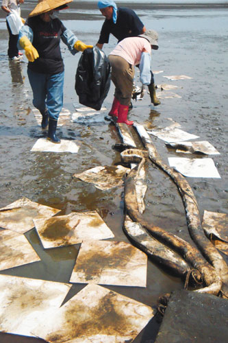 由于油污面積很大,大批消防及環(huán)保人員在濕地忙著除油,將吸油棉布丟入海灘,并布下攔油索框住油污,保護(hù)水筆仔、彈涂魚等自然生態(tài),相關(guān)單位表示,初步已控制,油污不再擴(kuò)散,攔油工作一直持續(xù)中。