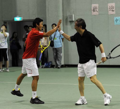 中新網(wǎng)7月6日電 據(jù)“中央社”報(bào)道,5日晚臺灣“中央研究院”網(wǎng)球場星光燦爛。剛打進(jìn)溫布爾登男單8強(qiáng)的盧彥勛與前“中研院長”李遠(yuǎn)哲搭配,迎戰(zhàn)以艾滋病雞尾酒療法聞名的何大一與廣州亞運(yùn)網(wǎng)球總教練連玉輝。