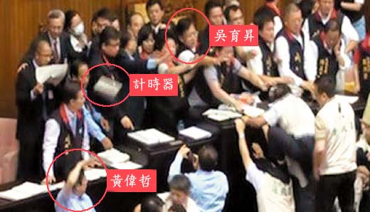 國民黨昨晚檢視錄像帶,原來是黃偉哲以“勾射”方式,冷不防向國民黨“立委”群集處拋出定時(shí)器,不偏不倚砸中吳育升頭部。