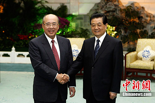 中新網(wǎng)北京7月12日電(記者 劉舒凌)12日下午17時(shí)30分許,中共中央總書(shū)記胡錦濤在北京釣魚(yú)臺(tái)會(huì)見(jiàn)率團(tuán)出席第六屆兩岸經(jīng)貿(mào)文化論壇的中國(guó)國(guó)民黨榮譽(yù)主席吳伯雄。(完)