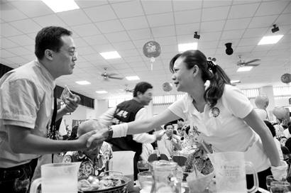 給記者記憶深刻的是,一直在我們身邊默默坐著的一對盛裝夫婦,他們?nèi)胱缶湍粤藘扇龢硬撕,突然聽到司儀說:“請郭添財?shù)娜!蔽疑磉叺钠炫叟繋е⑿,款款走上舞臺,拿起話筒開始說著洋洋灑灑的祝福語,然后話鋒一轉(zhuǎn):請給專業(yè)、認(rèn)真、負責(zé)的郭添財博士一個機會,給我們支持,好不好!我這才反應(yīng)過來,身邊這對夫婦竟然是大臺南市長候選人郭添財?shù)娜缛。郭家三嫂講完后,回到我們這一圓桌,舉杯和我們喝了口酒,然后從包里拿出郭添財?shù)拿纸o同桌的人,名片上包括郭添財?shù)膫人照片、從政簡介、競選口號和各種聯(lián)絡(luò)方式。分完名片,說完拜托的話,他們就站起來說:“我們要先走了,還要去趕下一場!