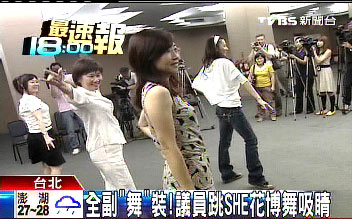 當(dāng)天下午,臺(tái)北市女議員脫下厚重套裝,換上輕便服,綁起馬尾,在臺(tái)北市議會(huì)勤練舞步。她們平日問政很犀利,跳起舞來(lái)也很認(rèn)真。