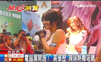 據(jù)臺(tái)灣TVBS電視臺(tái)報(bào)道,臺(tái)北計(jì)算機(jī)展大會(huì)舞臺(tái)還沒(méi)開鑼,參展廠商就派巧克力膚色辣妹開始搏版面,沒(méi)有舞臺(tái)就在展場(chǎng)地毯展現(xiàn)動(dòng)感。有的廠商由于和隔壁搞競(jìng)爭(zhēng)搶眼球,上午11點(diǎn)半的Show Gilr表演,足足提早1小時(shí)。