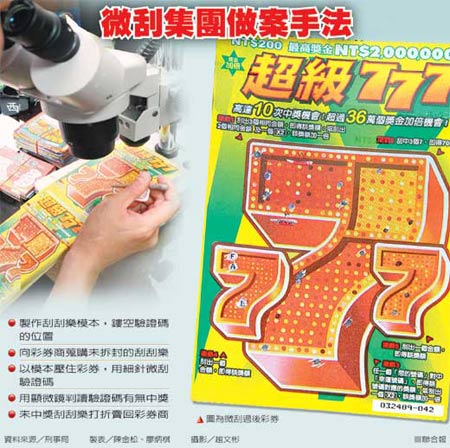 警方指出,翁子庸等人發(fā)現(xiàn)每張刮刮樂彩券的刮彩區(qū)內(nèi)都有驗證碼,例如中獎2000元的驗證碼是“T”、“T”、“H”,200元是“T”、“W”、“O”,三個英文字母看似隨機落點刮彩區(qū)內(nèi),實際上,落點都由計算機選擇集中在固定區(qū)塊;翁嫌取得彩券后,把彩券放在顯微鏡下,再使用自制細針點刮彩券刮刮膜5、6點,透過顯微鏡辨識驗證碼是否中獎落點。