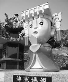 除了天顯宮,與臺軍方關系相當密切的廟宇,還有蘇澳中正軍港內(nèi)的媽祖廟進安宮。30多年來,進安宮成為當?shù)毓俦男叛鰧ο,各型軍艦進港都會前往祈福。去年底蘇澳民眾請示媽祖后,還捐資建立了一座高達3米的“海軍媽祖”石像(如圖),成為軍港的地標,據(jù)稱歷任海軍高級將領幾乎都會來這里上香。作為全臺唯一軍方與地方共管的廟宇,民眾到進安宮參拜媽祖,還要先登記,并且只有假日才能進香。