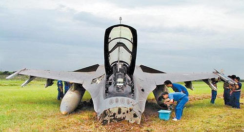 當(dāng)年6月26日機(jī)號6812的F-16B型雙座機(jī),由嘉義聯(lián)隊莊姓分隊長駕駛,后座載著“國防部”整評室副主任陳姓少將,進(jìn)行戰(zhàn)術(shù)攔截課目的熟飛,降落時,未注意跑道積水,致使戰(zhàn)機(jī)落地時,飛行員施放阻力傘后戰(zhàn)機(jī)嚴(yán)重右偏,雖然隨即拋棄阻力傘,立即使用方向舵及煞車改正偏右狀況仍無效,戰(zhàn)機(jī)降落跑道上行進(jìn)約一公里后沖向草坪,機(jī)身嚴(yán)重受損;經(jīng)評估修復(fù)戰(zhàn)機(jī),不包括發(fā)動機(jī)的修復(fù)即要花800多萬元新臺幣。
