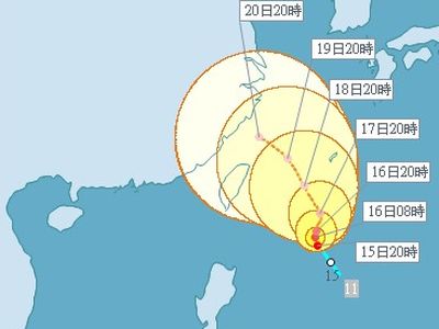 截至15日晚10時為止,輕臺凡那比的中心位置在恒春東方700公里海面上,以時速10公里速度向北北西轉(zhuǎn)北方移動。