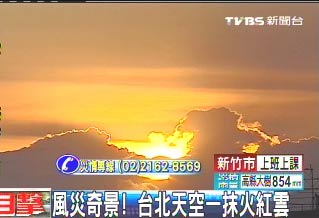 中新網(wǎng)9月20日電 早起的民眾是否注意到臺(tái)北今天的日出特別迷人嗎?據(jù)臺(tái)灣TVBS報(bào)道,臺(tái)風(fēng)“凡亞比”逐漸遠(yuǎn)離臺(tái)灣,臺(tái)北一早晴空萬(wàn)里,當(dāng)太陽(yáng)剛升起的時(shí)候,天空出現(xiàn)一大片的火紅云,早起出門(mén)運(yùn)動(dòng)的民眾,或是出門(mén)上課的學(xué)生,看到橘紅色的火紅云,都相當(dāng)震撼,隨著天色逐漸變亮,火紅云也慢慢消失。