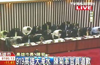 中新網(wǎng)9月28日電 據(jù)臺灣TVBS報道,針對919“凡亞比”臺風(fēng)造成高雄市大淹水,市長陳菊連日來遭到相當多的指控,今日,在市議會總質(zhì)詢時,陳菊特別率領(lǐng)市府官員向市民道歉。