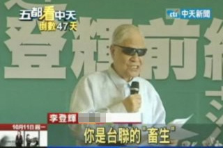 中新網(wǎng)10月12日電 據(jù)臺(tái)灣“今日新聞網(wǎng)”報(bào)道,“你是臺(tái)聯(lián)(‘臺(tái)聯(lián)黨’)的‘畜生’!”李登輝11日在替民進(jìn)黨新北市長參選人蔡英文站臺(tái)時(shí)出現(xiàn)口誤;蛟S是真的年紀(jì)大了,李登輝這次替蔡英文助陣,不但講到激動(dòng)處時(shí),手抖個(gè)不停,還口誤連連,讓坐在一旁的蔡英文只能尷尬地笑。